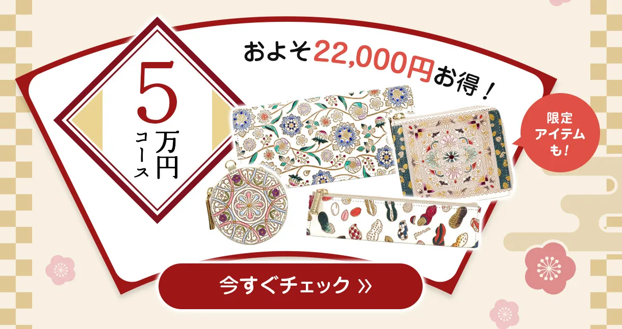 【福袋5万円コース】●全5点入り ●保証アイテム:L字ファスナーの小さなお財布(絢爛柄)/メガネケース [T5-23]