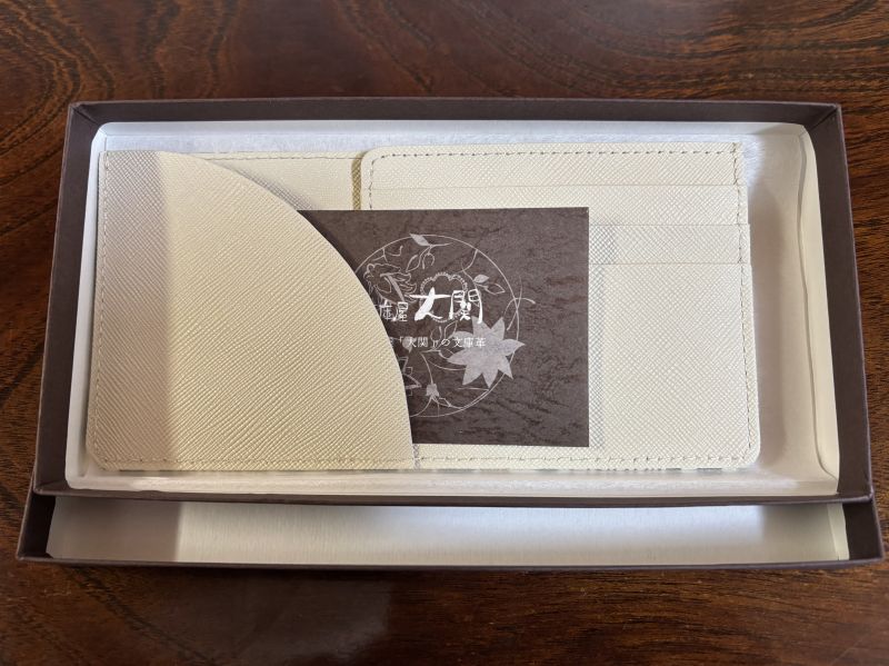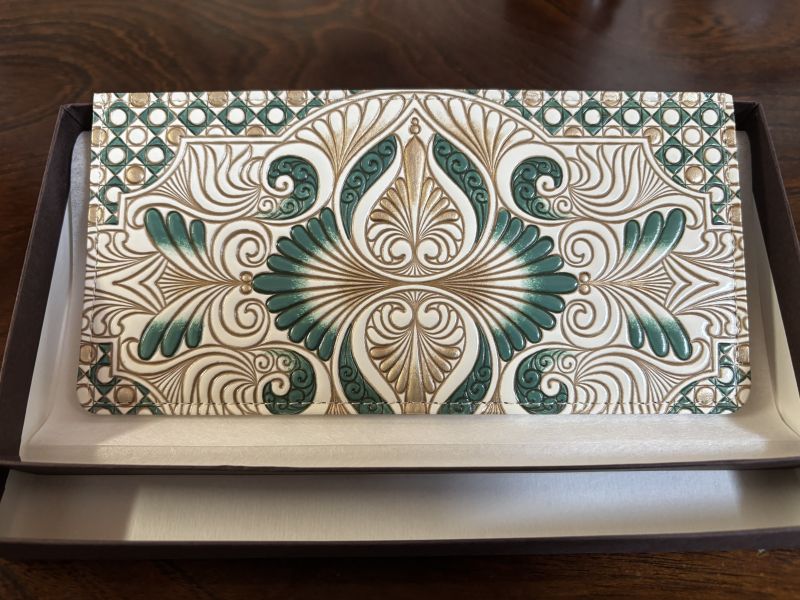 フラット札入れcacachan さん予約会で購入、届くまで待ち遠しかったです。アイビーグリーンが素敵な色で上品です。同時に購入した小銭入れと一緒に使う予定です。