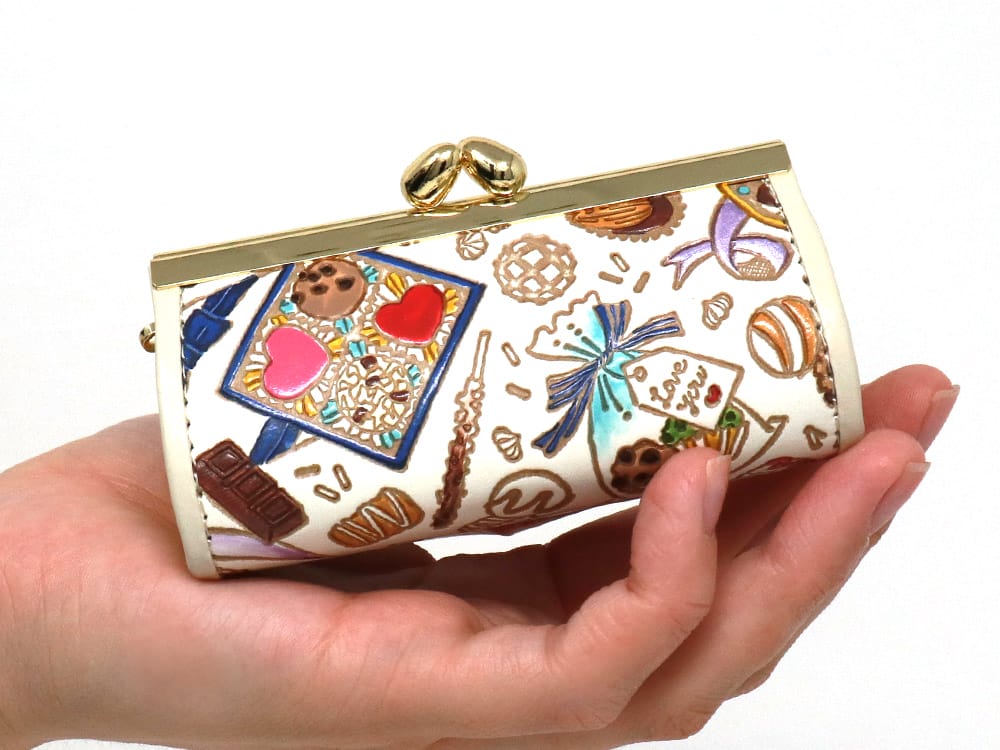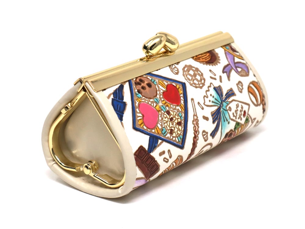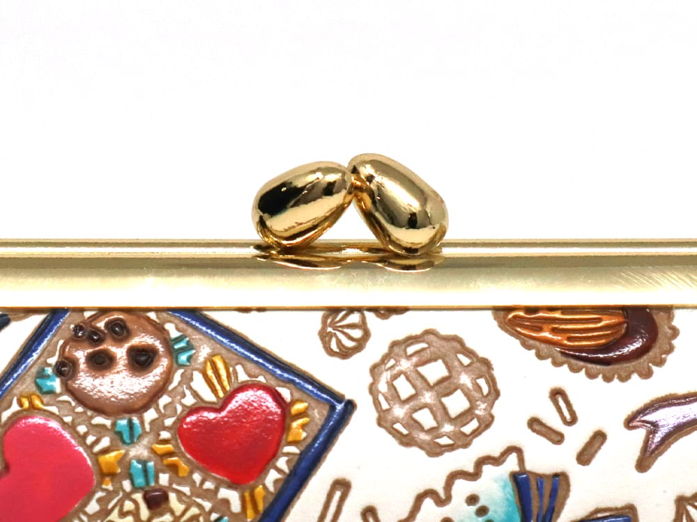 口金のゴールドが上品。両サイドはアイボリーの無地革にパイピング飾り