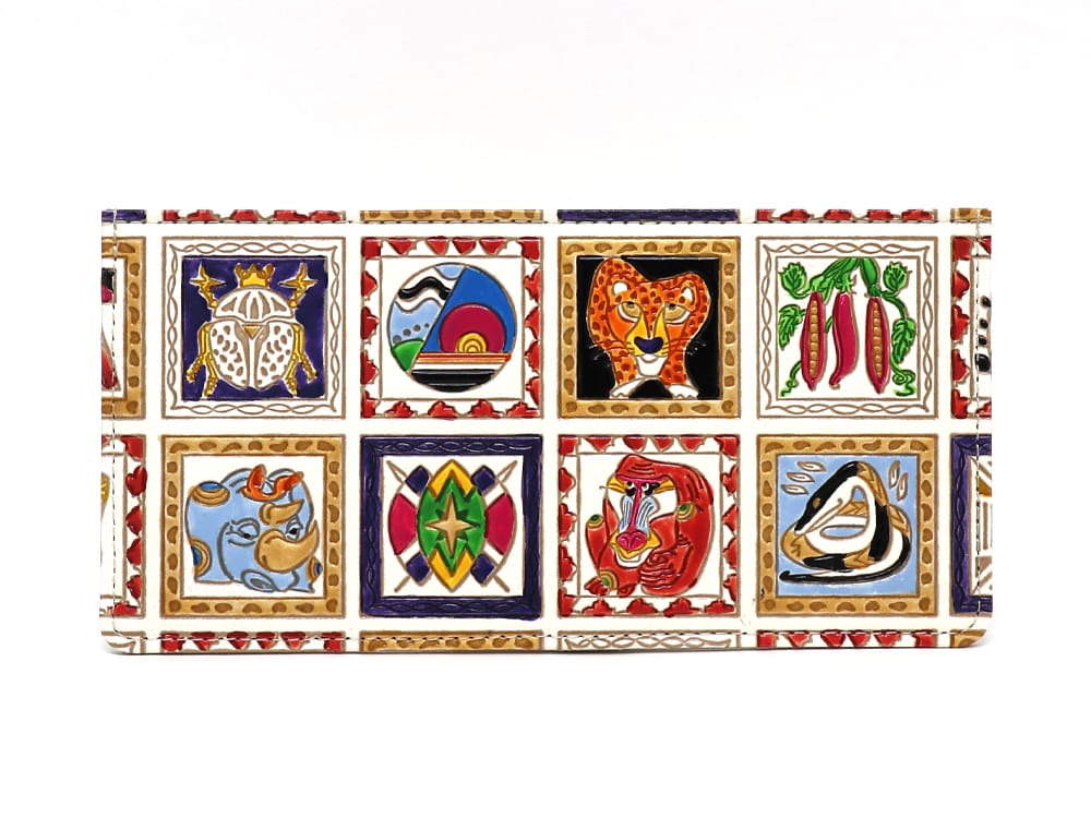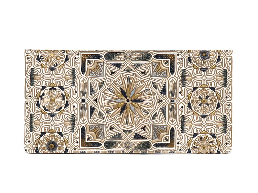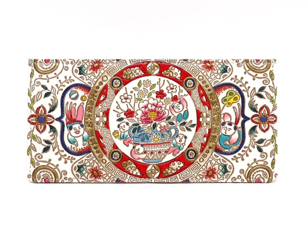 細かな紋様に華やかな色と金彩を施し、細かな部分も表情豊かに塗りわけています。金彩の煌きは絵の具を何度も塗り重ねることで深みを表現するなど、彩色にとても手間がかかる柄のため、通常柄や金唐柄と価格も異なります。福々しく、豪華で、きらびやかな絢爛柄を、ぜひお手元でご堪能下さい。