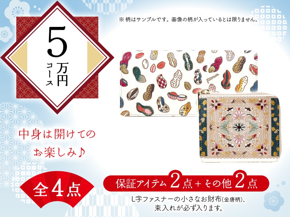 【福袋5万円コース】●全4点入り ●保証アイテム:L字ファスナーの小さなお財布(金唐柄)/束入れ