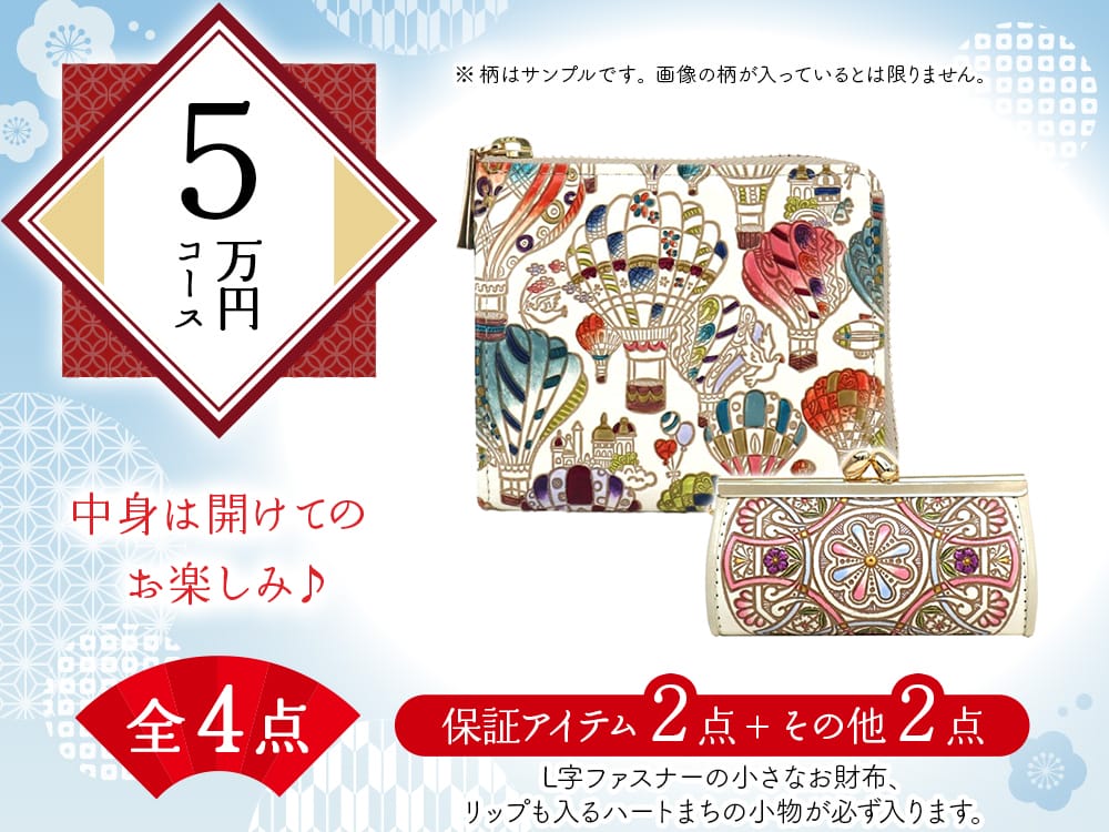 【福袋5万円コース】●全4点入り ●保証アイテム:L字ファスナーの小さなお財布/リップも入るハートまちの小物入れ