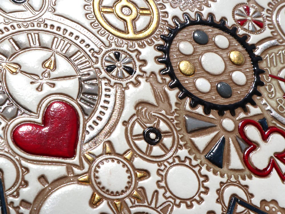時の歯車<赤黒> リップも入るハートまちの小物入れ(金唐柄)