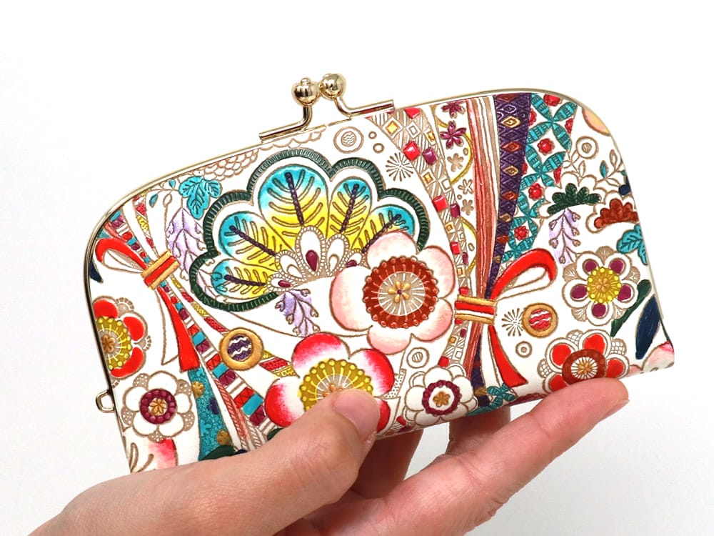 薄くて使いやすいがま口です。バッグの中でもかさばらず、帯にもはさめる薄さで和装にも最適。