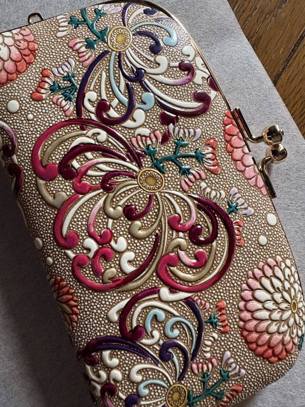 薄くて使いやすいがま口です。バッグの中でもかさばらず、帯にもはさめる薄さで和装にも最適。