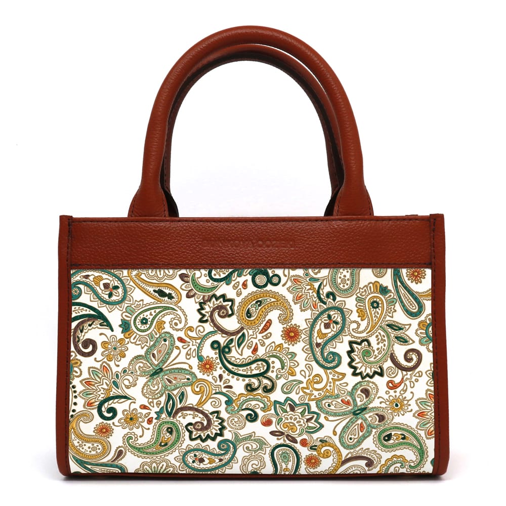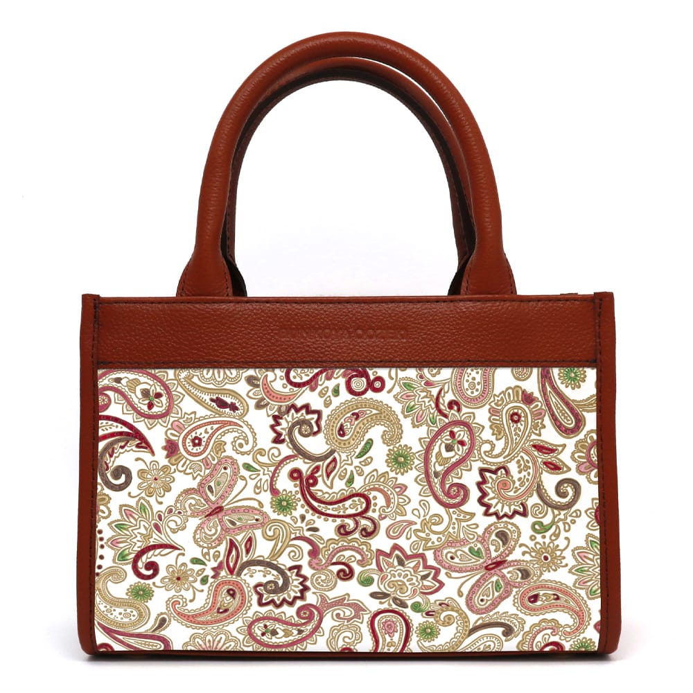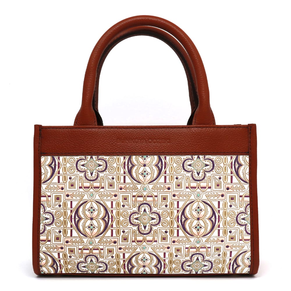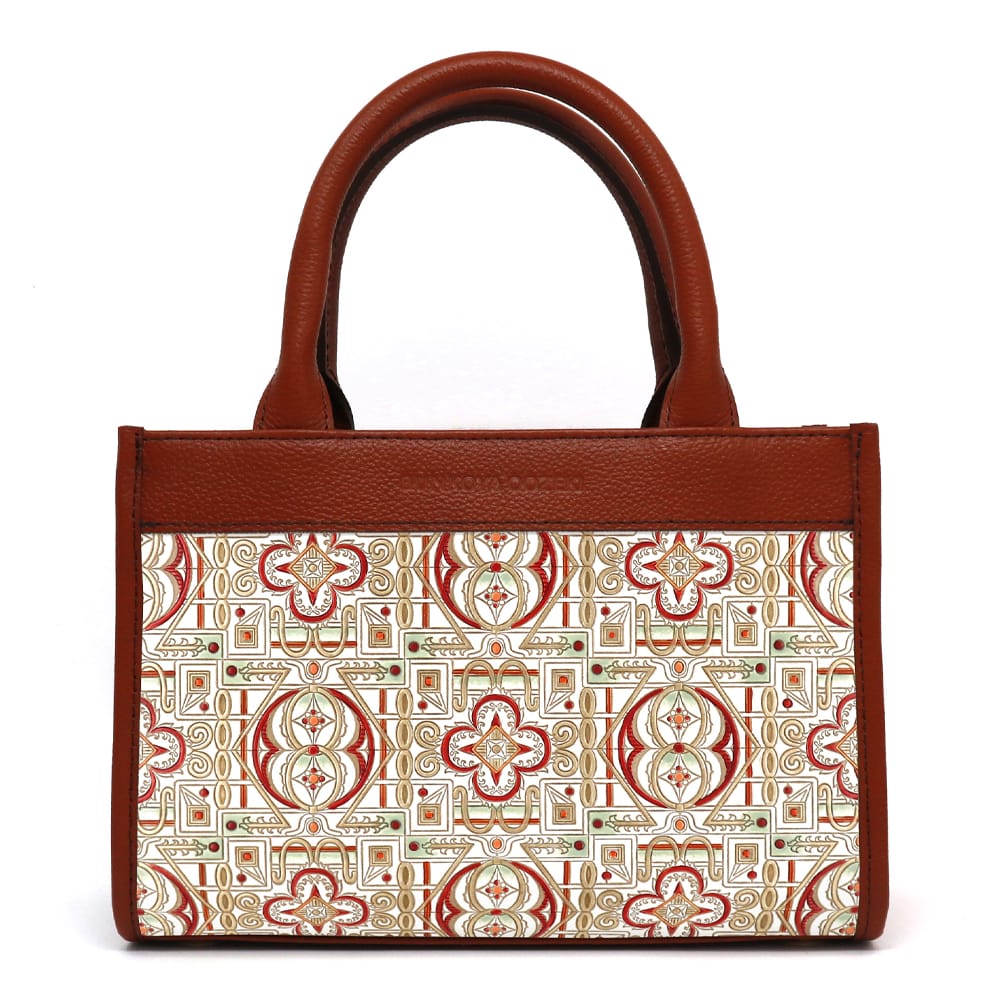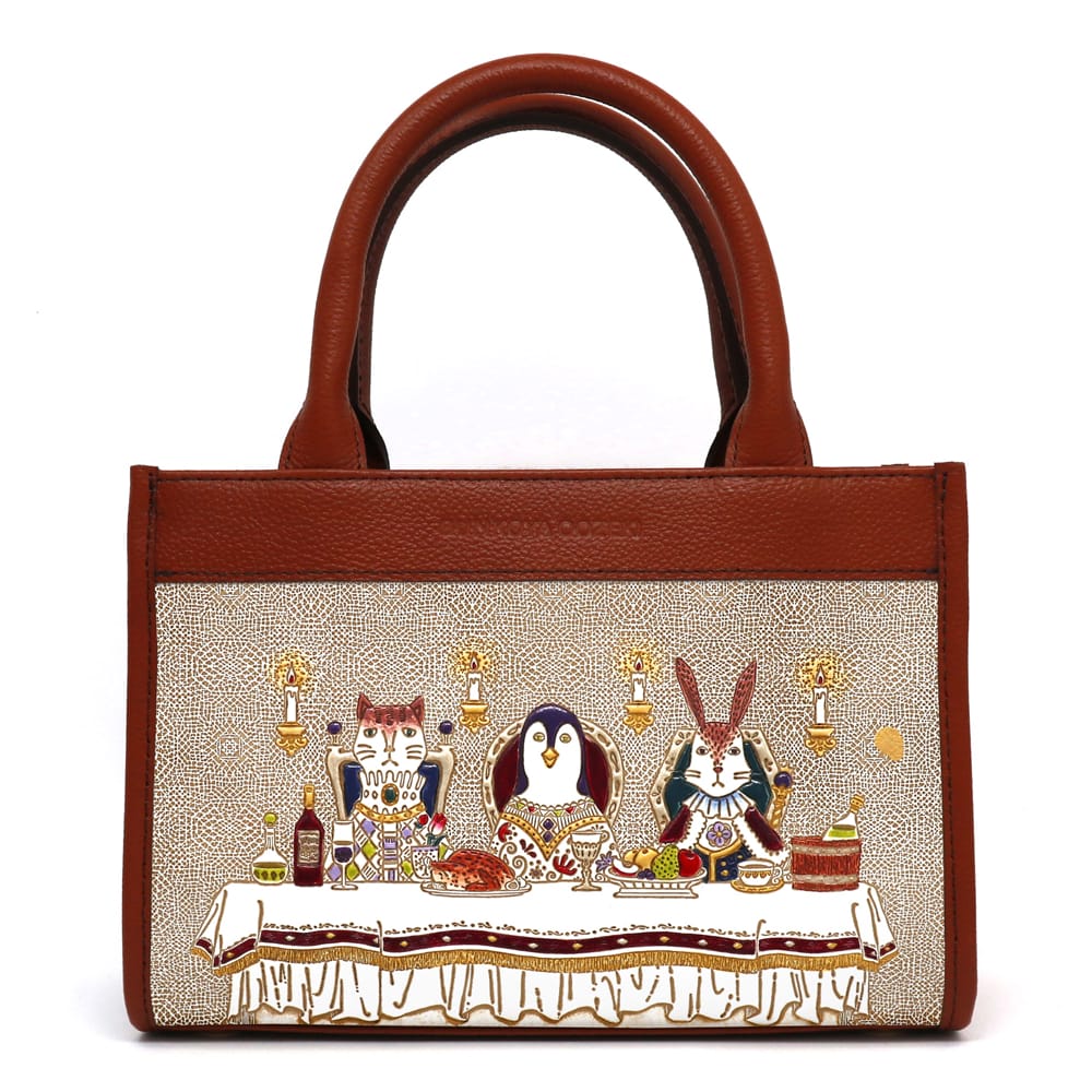 無地のバッグが多い中、ひときわ目を惹く柄トート。ハンド・ショルダー/斜め掛けの2way仕様。コンパクトながら広めのマチで、スマホやコスメポーチ、当店の「ぐるっとファスナーの長財布」まで収納可能。