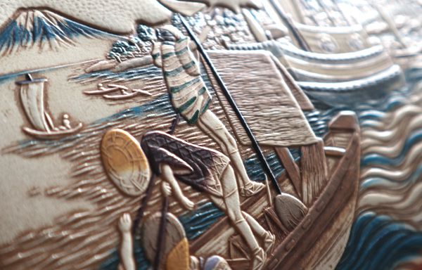文庫屋「大関」の浮世絵版は、100年近くの年月を経た貴重な版です。江戸時代から親しまれた日本の懐かしい景色の数々が、白革に型押しと彩色をすることで命を吹き込まれ、鮮やかで立体的な絵画のように甦ります。