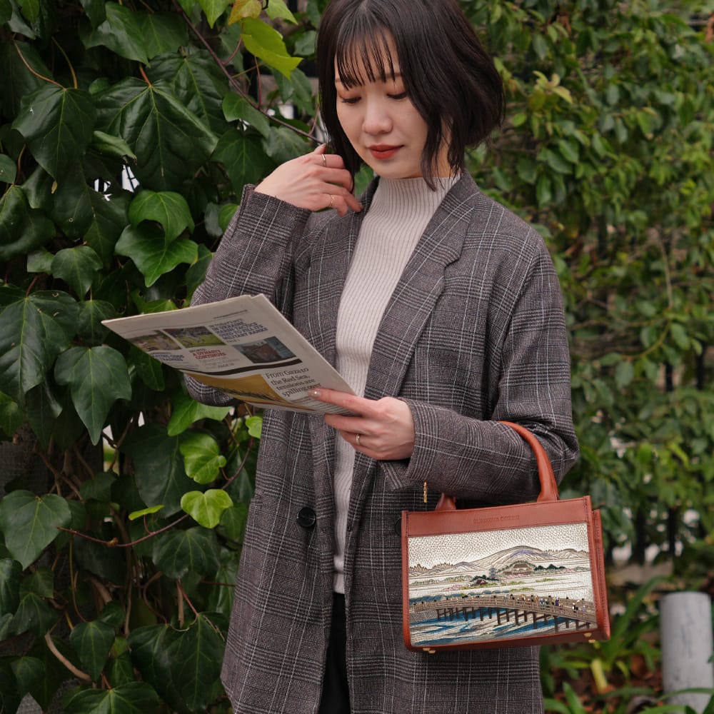 当店の浮世絵柄は古い版です。7柄のうち、このバッグに版の大きさが合うものは2柄です。他の柄では周囲にシボが出ますが、ご希望の場合はお問い合わせください。 -