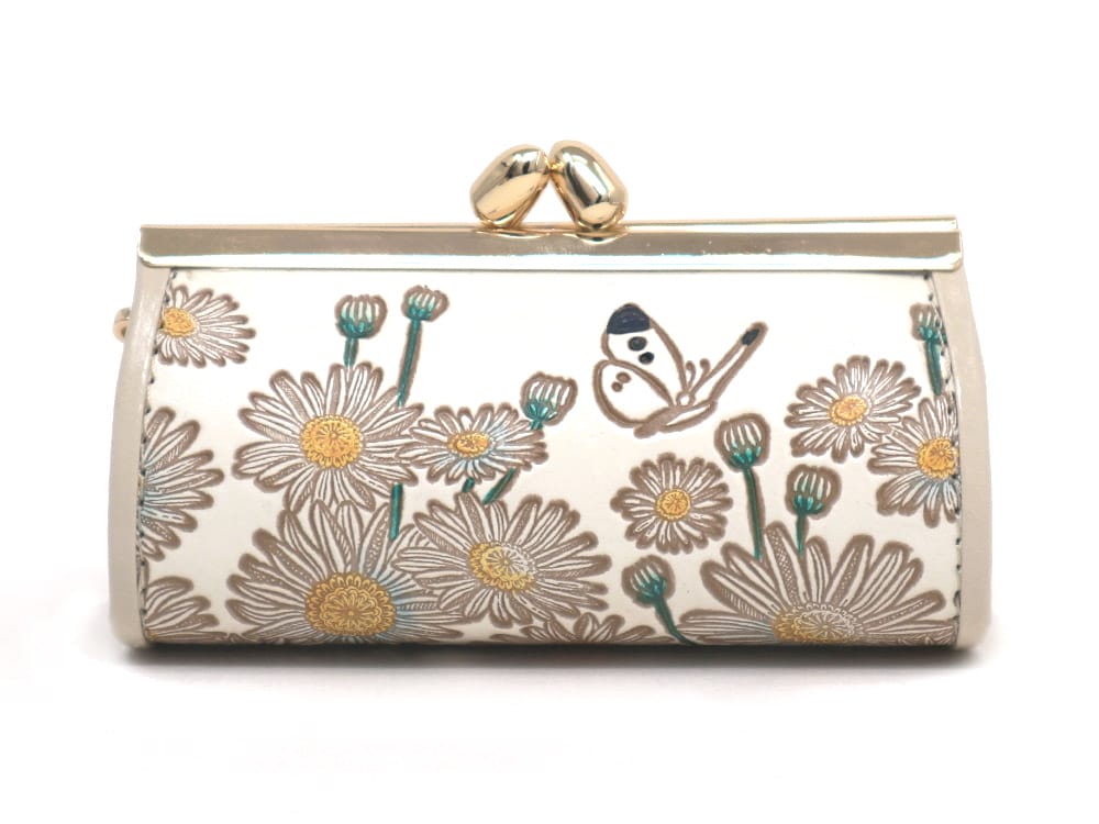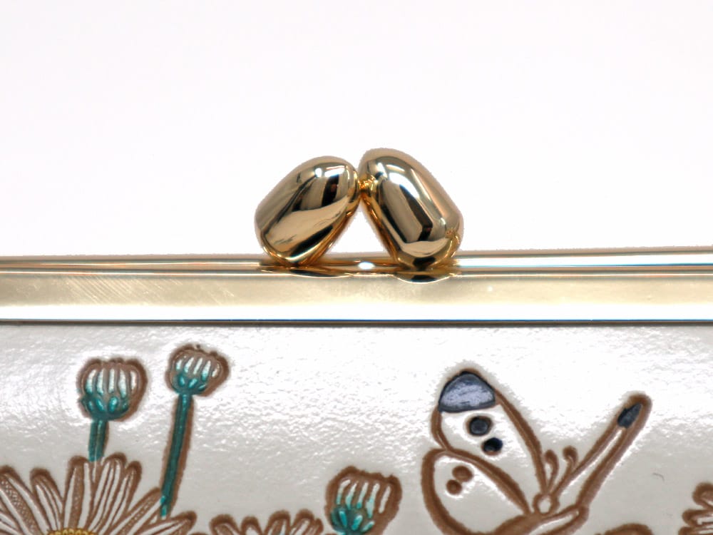 口金のゴールドが上品。両サイドはアイボリーの無地革にパイピング飾り