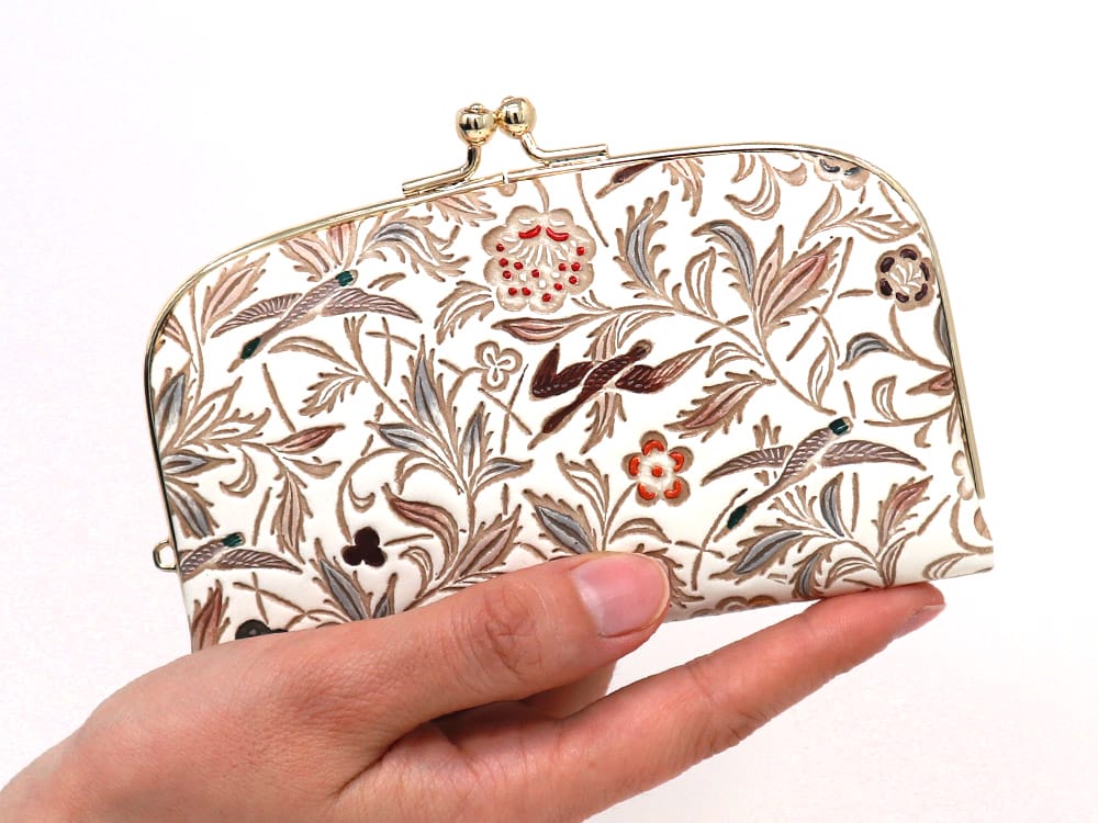 金具の下に袋がぶら下がる通常のがま口に対して、上部(天)に差し込み口(溝)がある”天溝がま口”は、金具が目立たずすっきり。 文庫革がより広い面積で美しく映えます。