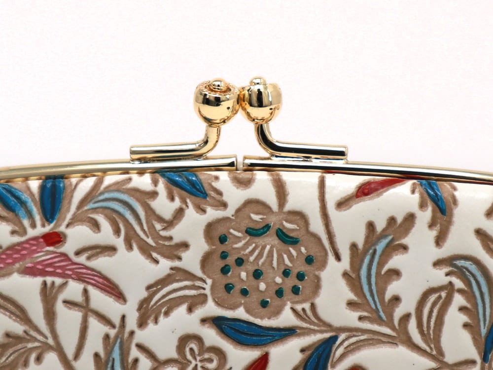 金具の下に袋がぶら下がる通常のがま口に対して、上部(天)に差し込み口(溝)がある”天溝がま口”は、金具が目立たずすっきり。 文庫革がより広い面積で美しく映えます。