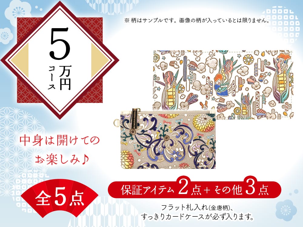【福袋5万円コース】●全5点入り ●保証アイテム:フラット札入れ(金唐柄)/すっきりカードケース