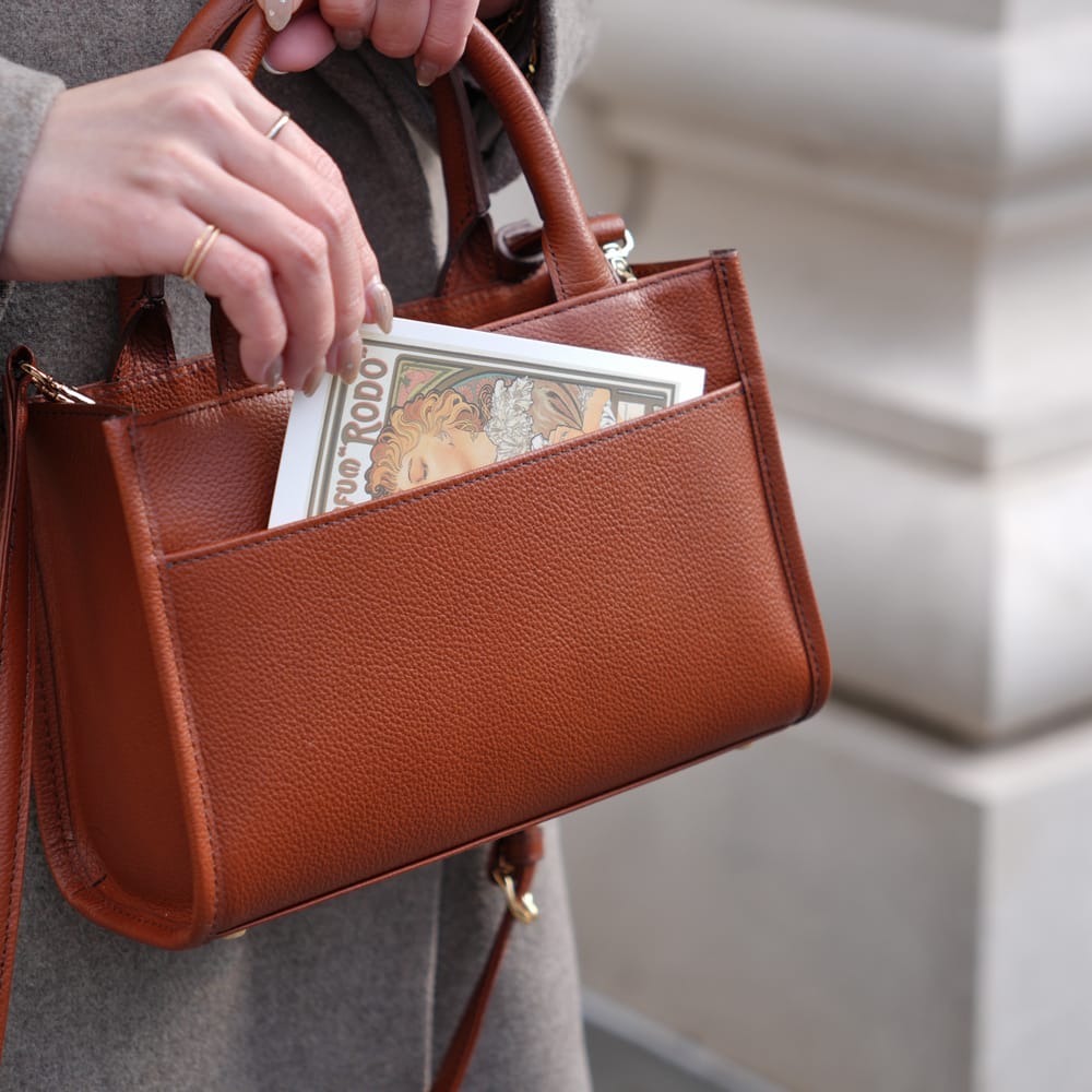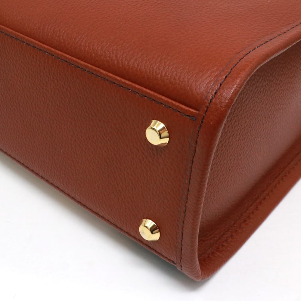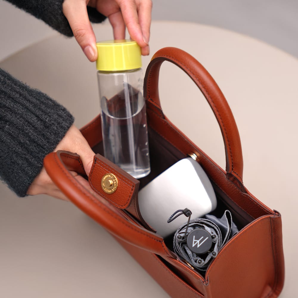 フェミニンなワンピースにも、カジュアルなデニムにも映える万能トートです。
