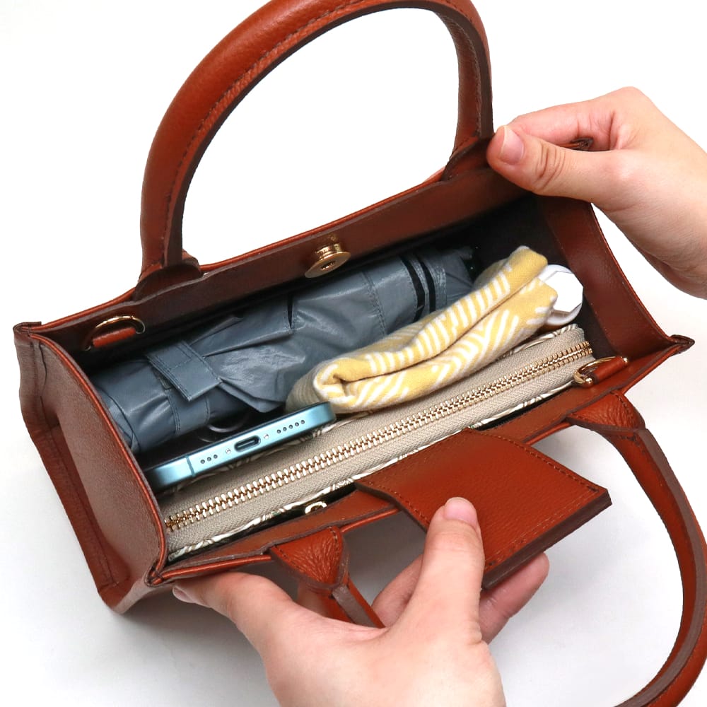 コンパクトながら広めのマチで、スマホやコスメポーチ、当店の「ぐるっとファスナーの長財布」まで収納可能。