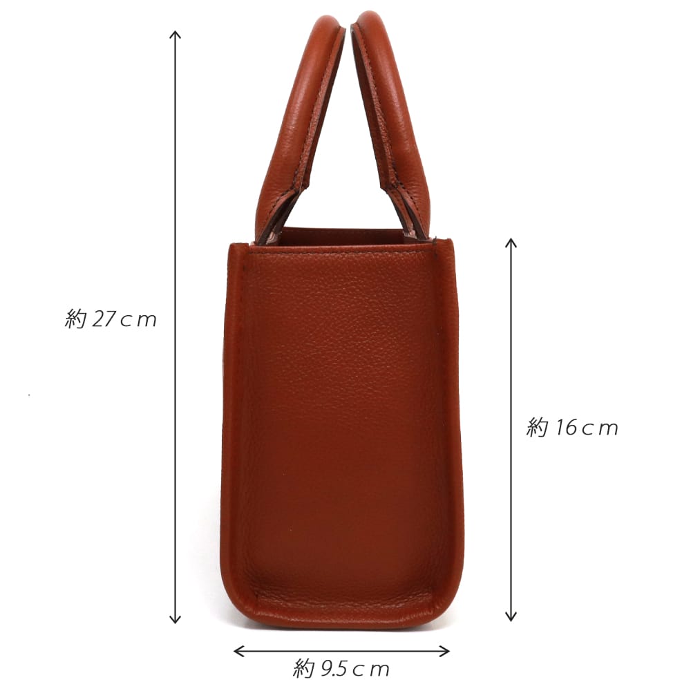 | 外寸 | 幅 (底部)約23.3cm(上部)約22.3cm,マチ約9.5cm,高さ約16cm,ハンドル高さ約11cm長さ約28cm |