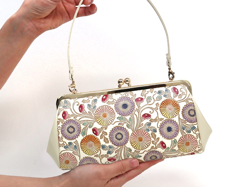 和装のとき、結婚式にお呼ばれしたとき、パーティーバッグとしても使えるサイズの、ハンドル付きのクラッチです。普段使いはもちろん、ドレス用にするか、和装用にするか…柄次第でいろいろなシーンで使えます♪